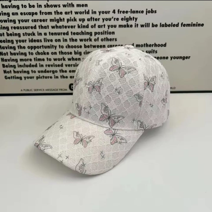 Add a whimsical touch to your everyday look with our Lace Butterfly Print Cap, the perfect blend of charm and comfort. This elegant cap features a delicate lace overlay adorned with beautifully illustrated butterfly designs and twinkling star accents, making it a unique fashion statement.